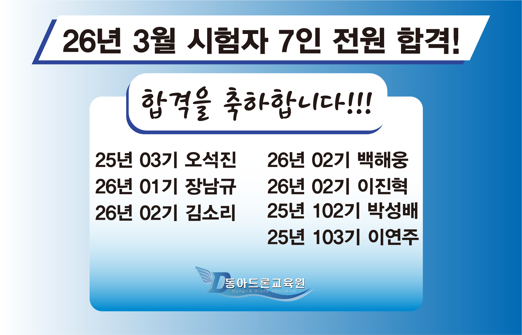 동아드론교육원은 여러분의 합격을 축하드리며 앞날의 건승을 기원합니다!